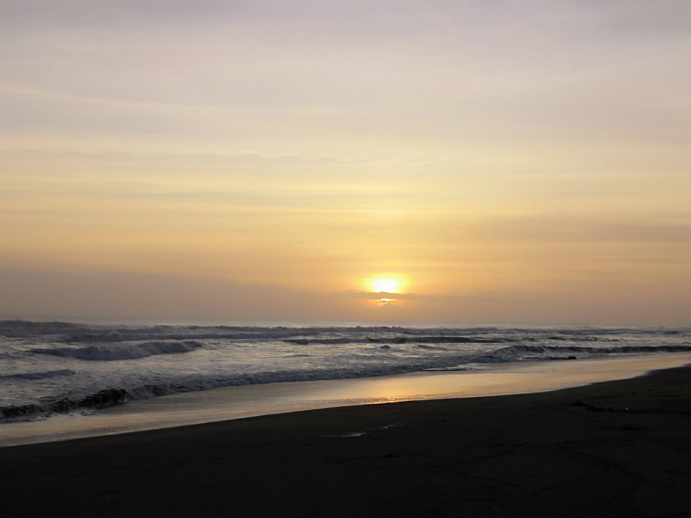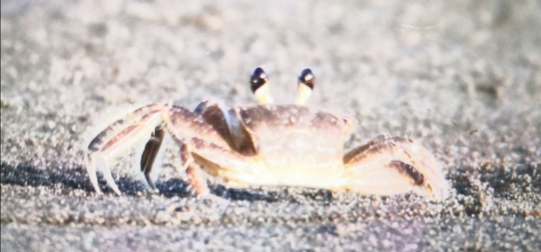 Dès le lever du jour, je me rend sur la plage pour assister au lever du soleil sur la mer. Des courlis corlieu et des pluviers de Wilson sortent au même moment pour aller se nourrir à la limite des vagues et un crabe lui se dépêche de rentrer à mon approche.
