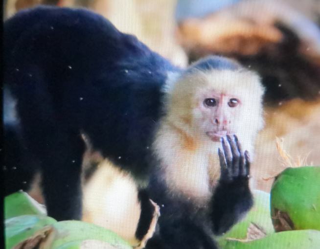 En attendant le départ en balade en forêt avec ma guide, un singe capucin vient déguster des noix de coco qui ont été entassées sur une brouette.