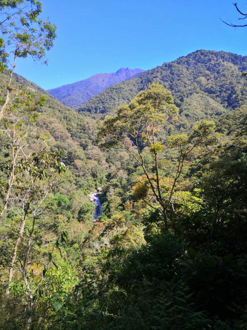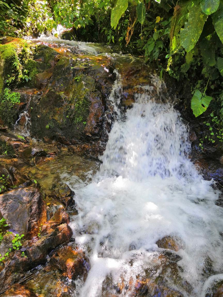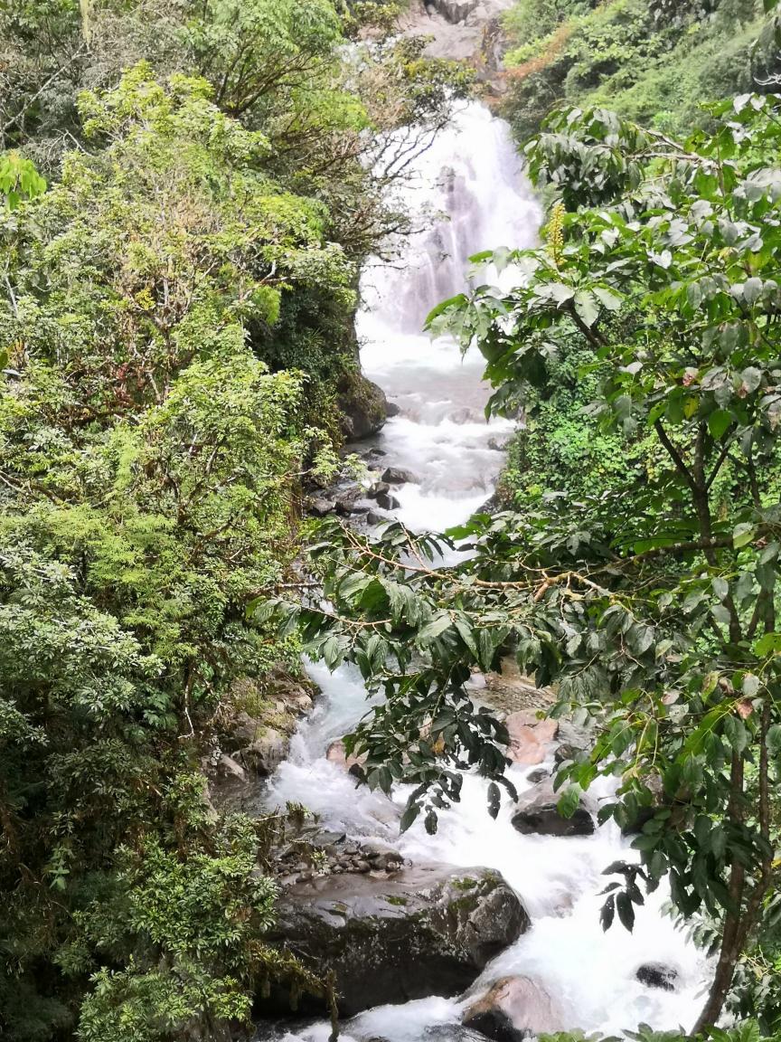 Nous partons en promenade dans la Cloudbridge Nature Reserve, le sentier est très facile techniquement mais bigrement escarpé. Il s’agit d’une forêt d’altitude mais des pays chauds avec pléthore de plantes poussant sur les arbres. De temps en temps nous voyons le Rio Chirripo qui coule bruyamment en contrebas tandis que le mont Chirripo, au loin, domine le paysage de ses 3820m (plus haut sommet du pays). À certains endroits le sentier rejoint le rio et nous permet de voir de belles cascades.