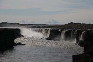 Tout d’abord Dettifoss et Selfoss, deux cascades successives particulièrement impressionnantes soit par la forme, soit par le débit. Dettifoss est une cascade linéaire et Selfoss est une cascade en forme de U tronqué et inversé. Bien que le lieu soit très fréquenté cela ne m’a pas beaucoup gêné vu la taille du site.