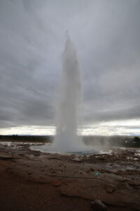 Revenons a la journée 13 Juillet. Je démarre avec une visite du côté de Geysir, qui a donné son nom au phénomène qui s’appelle maintient geyser . J’y vais de bonne heure car je subodore une fréquentation intense. Il y a bien sûr le geyser principal mais aussi plein de marmittes d’eau bouillonnante et quelques pistes pour admirer divers points de vue. J’y croise aussi une becassine des marais qui a choisi de somnoler à moins d’un mètre du sentier mais grâce à son mimétisme je dois être le seul à l’avoir repéré.
