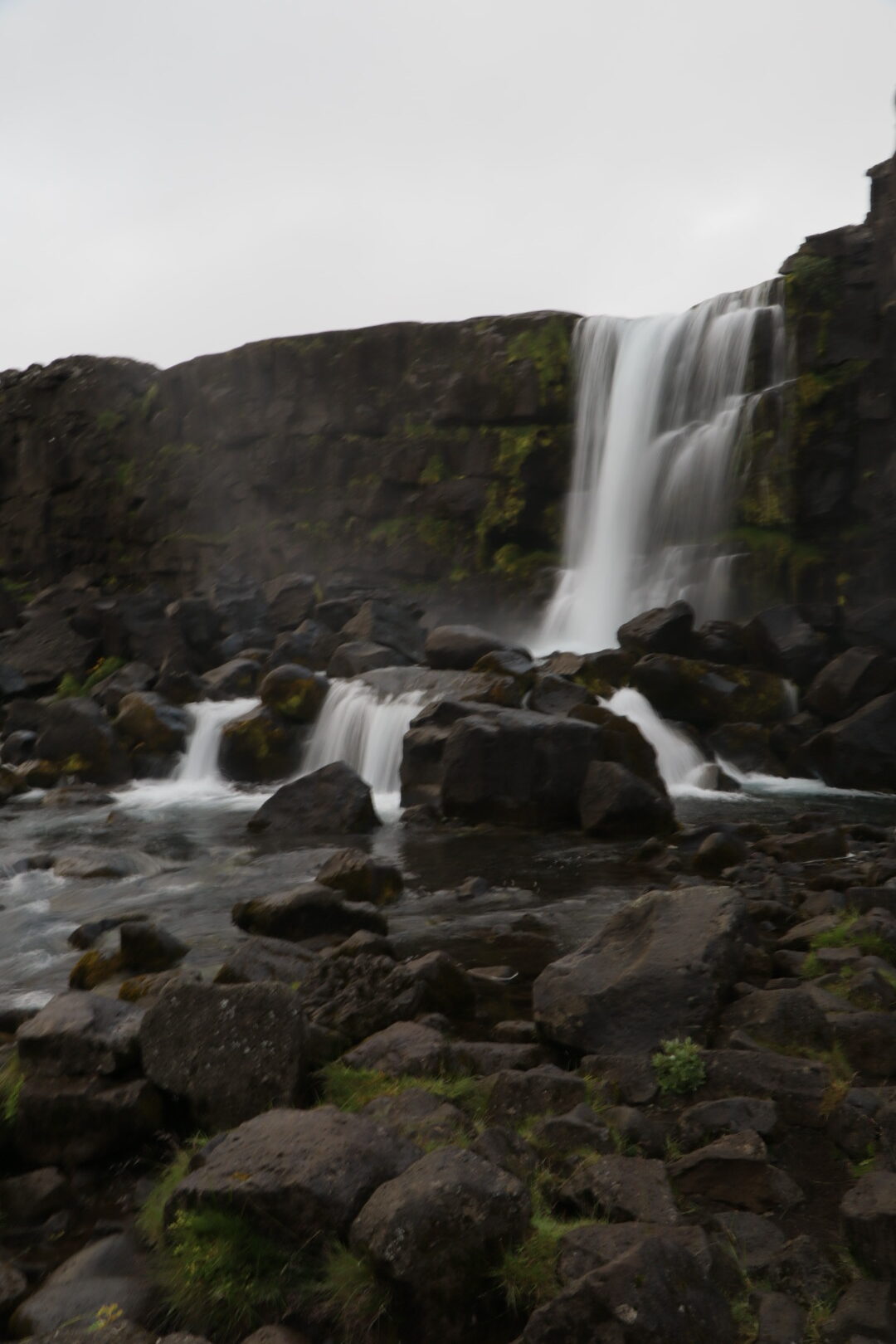 Puis Oxanàrfoss, jolie cascade enlaidie par les touristes qui se mettent devant en prenant des poses intrigantes: victorieux, songeur, rigolards. Comme en plus le temps était un peu pluvieux les dits touristes étaient attifés de ponchos difformes en vrai plastique colorédans la masse, bref un cauchemar d’ophtalmologiste et de photographe.
