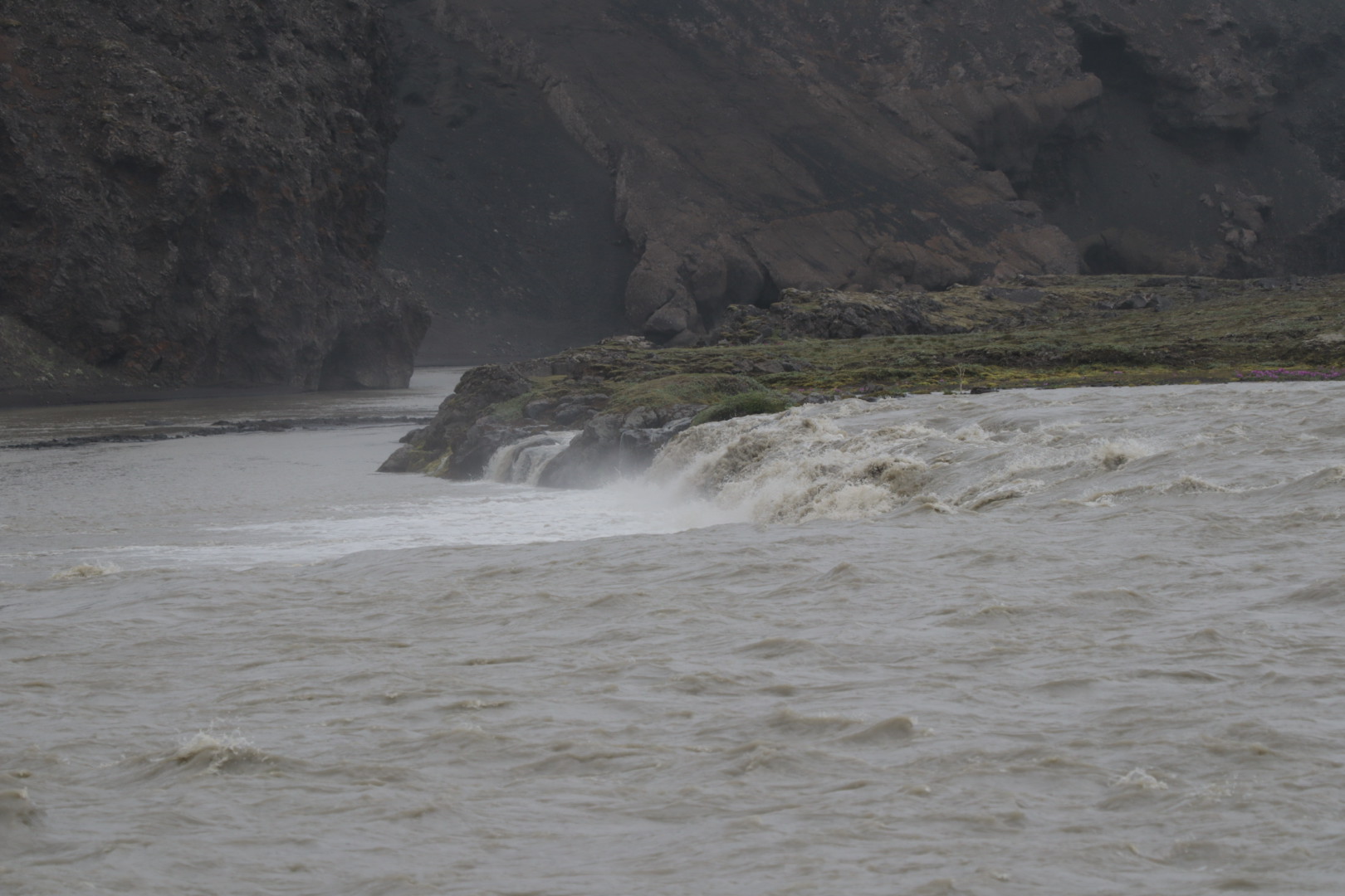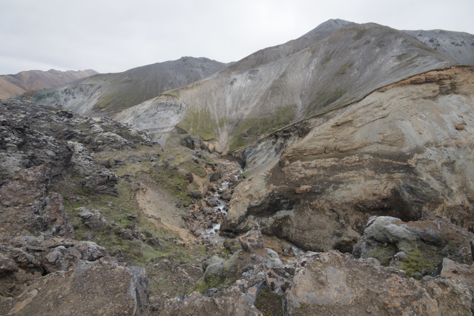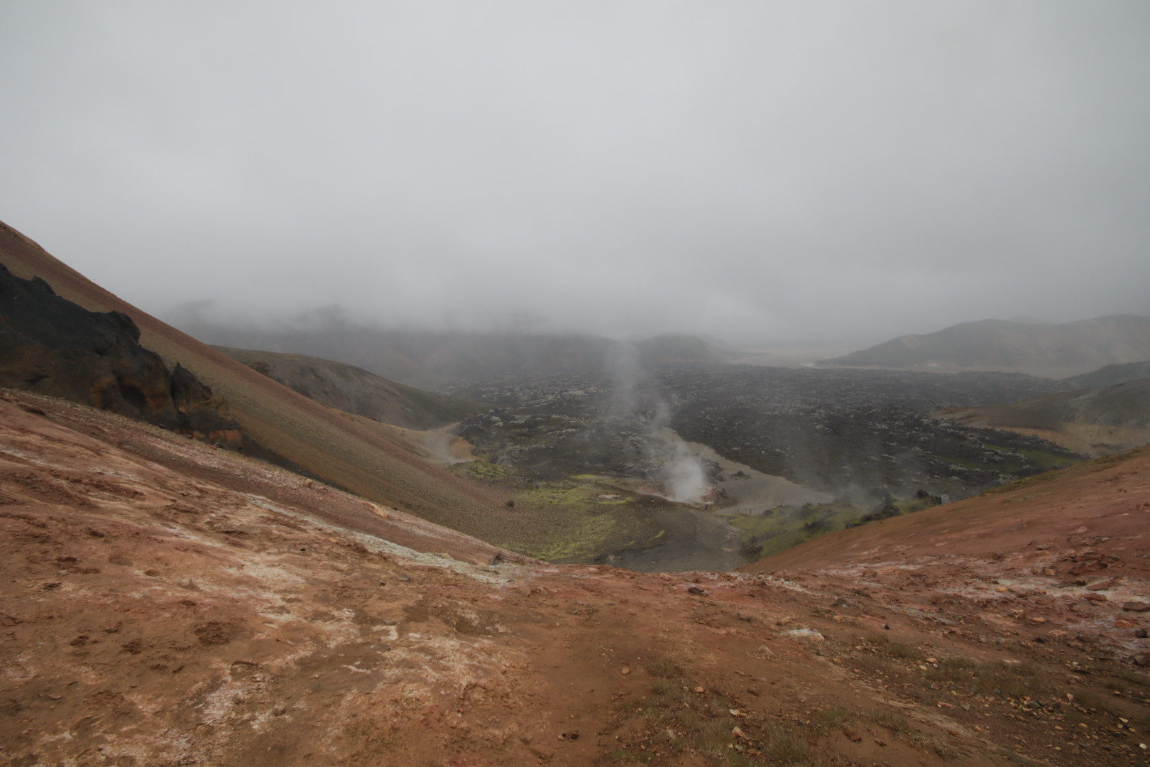 Bon je pars donc en balade sous un ciel plombé pour aller voir les solfatares de Brennisteinsalda. J’arrive ensuite à un carrefour avec le choix de rentrer ou de continuer sur un autre chemin. Comme je trouve la balade un peu courte, je decide de poursuivre quitte à faire demi-tour plus tard. Ce que je fais lorsque, prenant de l’altitude je me retrouve brumisé et decoiffé par les éléments. Je met á l’abri appareils photo, sors et installe le sursac imperméable et enfile mon imperméable. Au bout de 500m je croise un panneau indiquant le retour au camp à 3,5km, je fais alors demi tour et reviens en traversant une superbe coulée de lave puis en suivant un ruisseau.